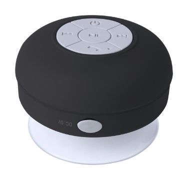Splashproof (IPX4 protection) bluetooth speaker with rubber-coated housing and large suction cup. With hands-free call function and built-in rechargeable battery. Including USB charger cable.