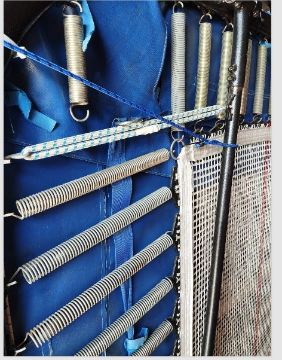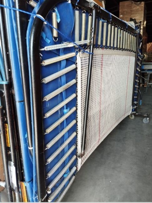 Full-size folding trampoline with a reinforced steel frame, designed for Rebound Therapy, PE, and gym use across all age groups and abilities. It includes 100 springs (elastic or steel), high-quality foam-filled PVC coverall pads and roller stands for smooth transport and compact storage.