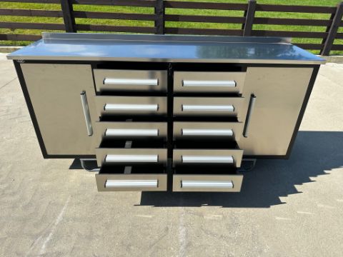 Brand New Unused Stainless Steel 7ft Work Bench with 10 Drawers, 2 Cabinets