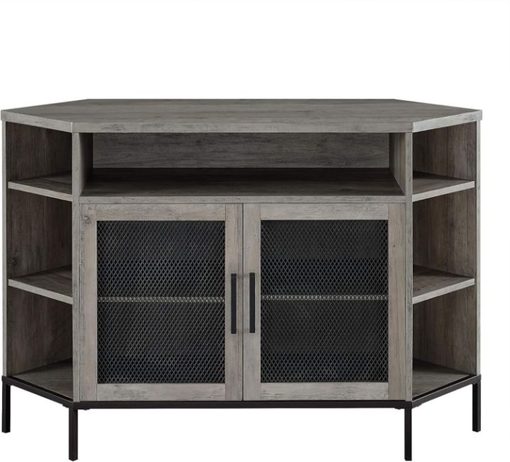 Walker Edison Eden Bridge Designs Modern Metal Mesh and Wood Corner Universal TV Stand with Open Shelves Cabinet Doors Storage for TVS up to 52" Flat Screen Living Room Storage Entertainment Centre,48 Inch, Grey Wash