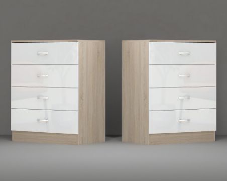 2 X Chest of 4 drawers - The 4 drawer chest is an excellent addition to our high gloss bedroom furniture range of stylish yet affordable furniture. The 4 drawer chest provides you with the storage space that a wardrobe cannot. The sturdy individual drawers are in one column of 4. They can take a remarkable amount of weight due to the high strength manufactured wood veneer frame. The drawers fit flush and are manufactured to strict conditions which mean they are stable and firm.