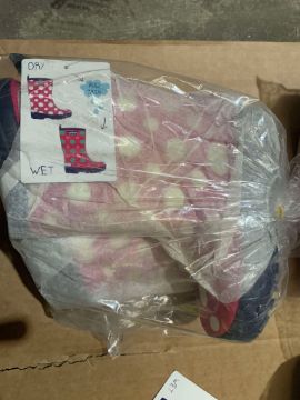 A bulk lot of 100 pairs of Squid Kids wellies. This lot includes 10 boxes of brand-new, colour-changing Squid Kids wellies in a mix of various sizes, styles, and colours.