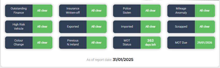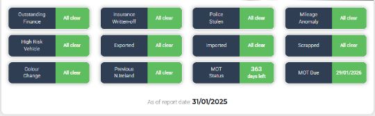 As of report date {31/01/2025} HPI report is all clear - See image!