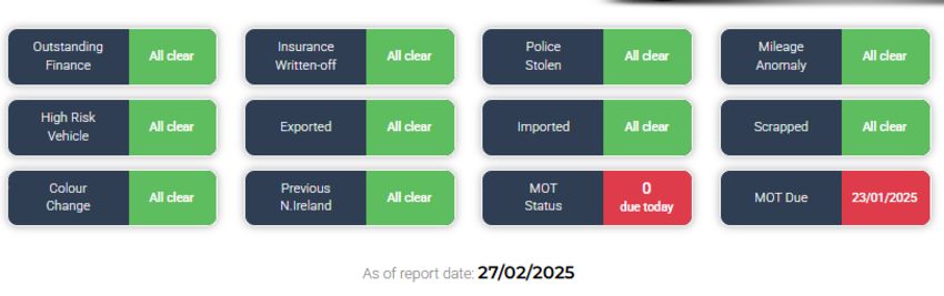 As of report date {27/02/2025} HPI report is all clear - See image!