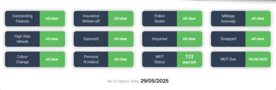 As of report date {29/05/2025} HPI report is all clear - See image!
