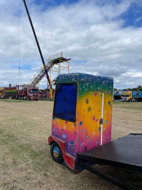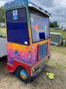 Fairground paybox in style of a truck has electric hook up from the outside and 2 3 pin sockets steel shelf around inside fully fiberglass fits in back of long wheel base van not on wheels plastic windows one on front had had repair eary to take out and used as slush stand or paint and put back to a security booth buyers preference