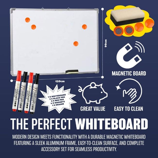 You will receive: 1 x Whiteboard 2 x Black Pen 2 x Red Pen 4 x Magnets 1 x Eraser