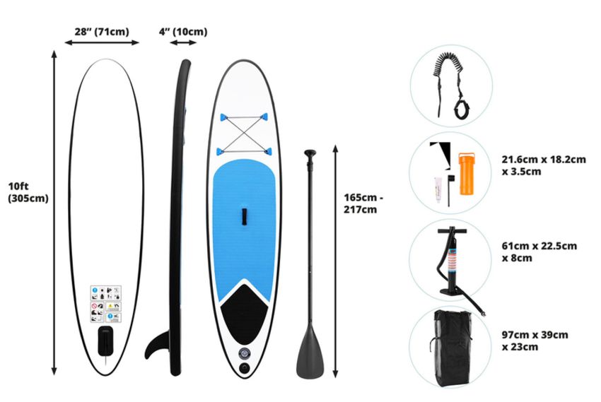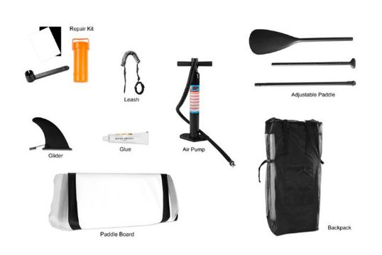 Contents: This set includes a paddle board, hand pump, carry bag, removable fins, spiral leash and repair kit.