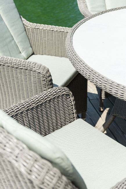 Within the Alexander Rose Hazelmere Range you will find beautifully hand-woven garden furniture. Hazelmere offers the perfect combination of style, colour and quality to grace your outdoor (or indoor) space. This collection is perfect for traditional country gardens, and conservatories/orangeries. Manufactured with a 4mm round profile weave and a lightweight aluminium frame. The Hazelmere weave pattern features the most classical basket weave design, which is complimented with the stunning colour of a Grey weave with ‘Pistachio’ cushions. The Alexander Rose Hazelmere range includes dining and lounging furniture, as well as some unique accessories such as daybeds and loungers. All tables in this range feature a unquie ceramic effect inset table top… the icing on the cake. A full 3-year (conditional) warranty is offered with all Alexander Rose Hazelmere products.