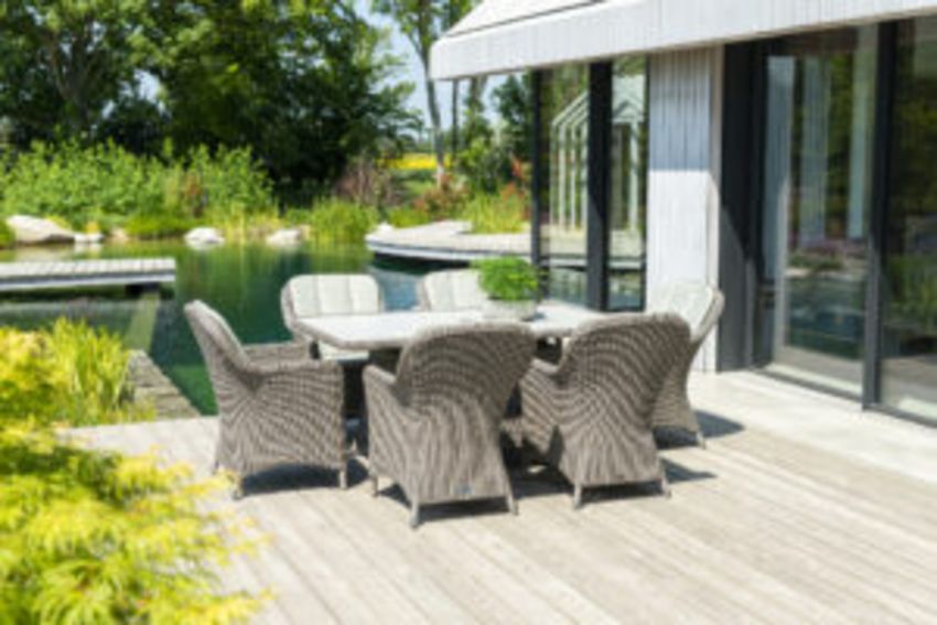 Within the Alexander Rose Hazelmere Range you will find beautifully hand-woven garden furniture. Hazelmere offers the perfect combination of style, colour and quality to grace your outdoor (or indoor) space. This collection is perfect for traditional country gardens, and conservatories/orangeries. Manufactured with a 4mm round profile weave and a lightweight aluminium frame. The Hazelmere weave pattern features the most classical basket weave design, which is complimented with the stunning colour of a Grey weave with ‘Pistachio’ cushions. The Alexander Rose Hazelmere range includes dining and lounging furniture, as well as some unique accessories such as daybeds and loungers. All tables in this range feature a unquie ceramic effect inset table top… the icing on the cake. A full 3-year (conditional) warranty is offered with all Alexander Rose Hazelmere products.