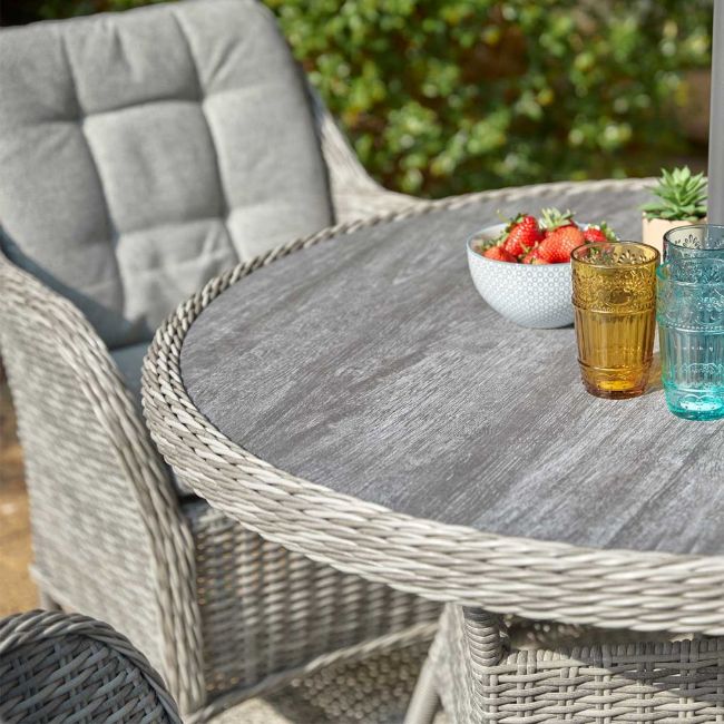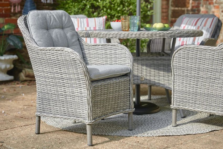 Featuring: Stain Resistant Fabric, Season-proof cushions, Environmentally Friendly EcoCore, 3 year Warranty, Handwoven Poly-Rattan with authentic wicker effect, Twisted Rod Weave Trim, UV resistance, Powder Coated Lightweight Frame, Wood Effect Strengthened Ceramic Coated Safety Glass Top.. This product is made from high-quality materials such as Poly-Rattan, Aluminium, EcoCore Poly Fibre, Spun Polyester Fabric, Ceramic Coated Glass,.