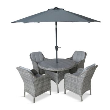 Experience the perfect blend of functionality, style with the St Tropez Stone 4 Seat Dining Set with 2.5m Parasol.
