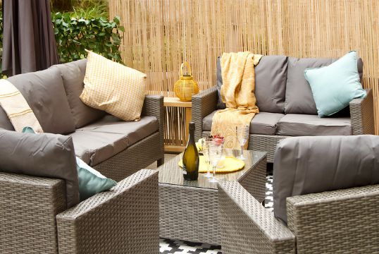 Comprised of a three-seater sofa, a two-seater sofa, two armchairs, a stool, and a toughened glass-topped coffee table.