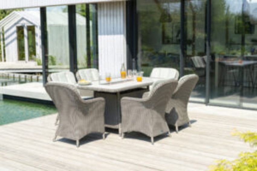 Within the Alexander Rose Hazelmere Range you will find beautifully hand-woven garden furniture. Hazelmere offers the perfect combination of style, colour and quality to grace your outdoor (or indoor) space. This collection is perfect for traditional country gardens, and conservatories/orangeries. Manufactured with a 4mm round profile weave and a lightweight aluminium frame. The Hazelmere weave pattern features the most classical basket weave design, which is complimented with the stunning colour of a Grey weave with ‘Pistachio’ cushions. The Alexander Rose Hazelmere range includes dining and lounging furniture, as well as some unique accessories such as daybeds and loungers. All tables in this range feature a unquie ceramic effect inset table top… the icing on the cake. A full 3-year (conditional) warranty is offered with all Alexander Rose Hazelmere products.