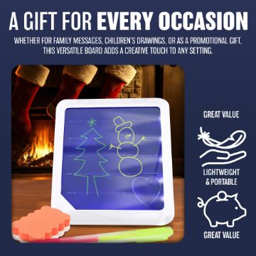 DESIGN - your favourite pictures on create your own designs on the lightweight and durable light up drawing board and watch them come to life! Easily wipe the board clean and start again. This fantastic craft set includes a neon effect luminous drawing board