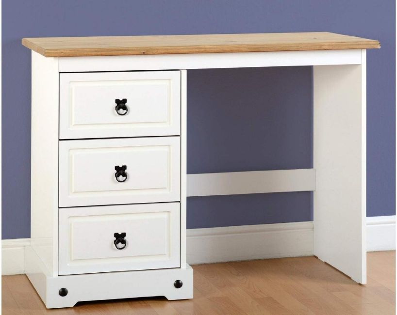 Three drawer dressing table in white with distressed waxed pine top featuring metal handles