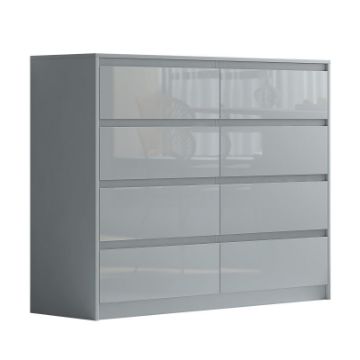 This 8 drawer Handleless chest is an excellent addition to our high gloss bedroom furniture range of Sleek and Stylish furniture. The 8 sturdy individual drawers are in 2 columns of 4. They can take a remarkable amount of weight due to the high strength manufactured wood veneer frame. The drawers fit flush and are manufactured to strict conditions which mean they are stable and firm. With its clean simple design and rich high gloss finish to the drawer fronts, this chest will blend in seamlessly with any modern or traditional bedroom. Manufactured from high grade chipboard with an authentic wood/matt effect finish to the carcass and luxury high gloss fronts (drawers).