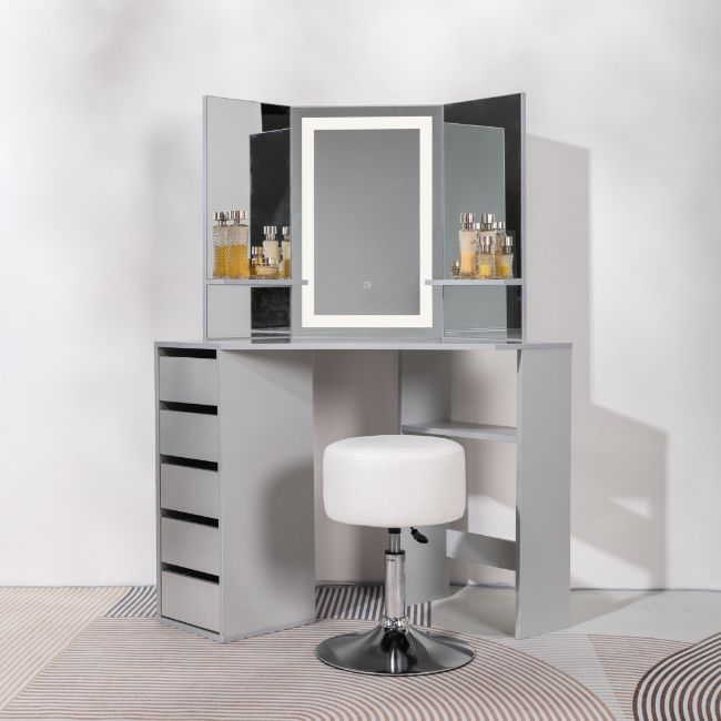 This Corner Dressing Table has 5 Drawers, 3 shelves, 3 mirrors(one with a gorgeous touch button led light). and also comes with a nice adjustable stool.