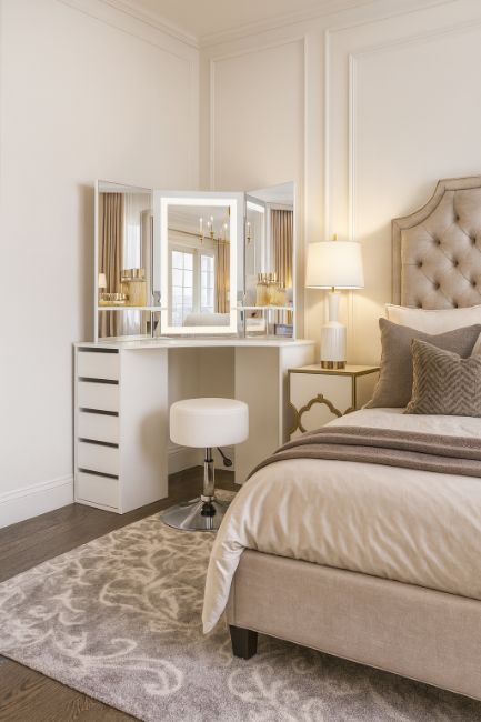 This Corner Dressing Table has 5 Drawers, 3 shelves, 3 mirrors(one with a gorgeous touch button led light). and also comes with a nice adjustable stool.