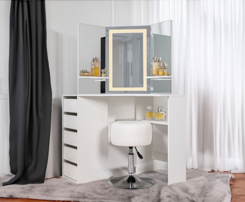 This Corner Dressing Table has 5 Drawers, 3 shelves, 3 mirrors(one with a gorgeous touch button led light). and also comes with a nice adjustable stool.