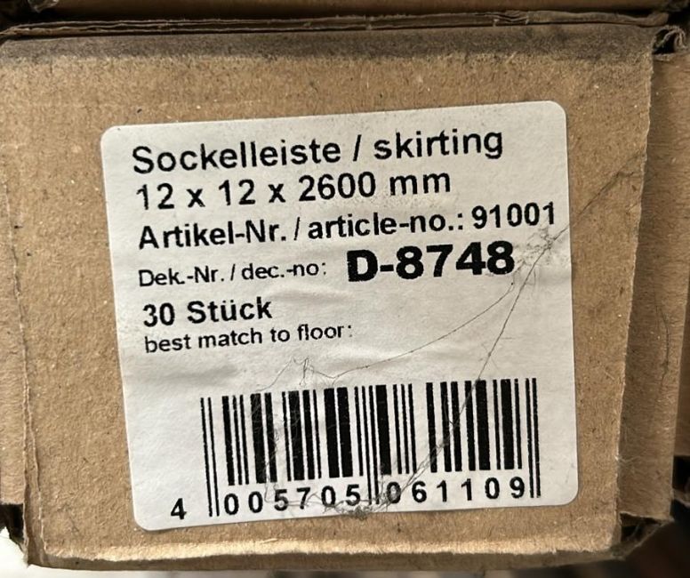 30 BXS (900 LENGTHS) LAMINATE FLOOR BEADING 12X12X2600MM SPLIT ACROSS 6 COLOURS.