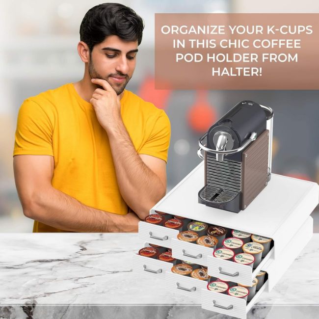 • A coffee pod holder designed to support your daily coffee needs; Divided into 6 rows each carrying up to 6 k cups; Holds up to 36 single serving coffee pods; Keeps your kitchen organized