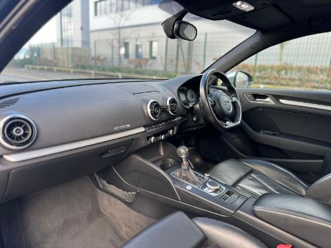 This 2014 AUDI S3 QUATTRO S-A 2.0L Petrol Hatchback in Black, with 94,000 miles, offers a high specification including a panoramic roof, Maxton Kit, and heated seats. The Audi S3, positioned as a performance-oriented compact executive car, sits at the top of the A3 model range. This S3 model features a 1984cc engine and a semi-automatic transmission, delivering power through its Quattro all-wheel-drive system. The vehicle is ULEZ compliant and will be supplied with a full logbook and 12 months MOT. The vehicle features a comprehensive specification, including cruise control, a reverse camera, front and rear parking sensors, folding mirrors, electric windows, electric mirrors, a wide screen display, navigation system, Bluetooth connectivity, and a multifunctional steering wheel. Alloy wheels complete the exterior presentation. Six years of service history are noted. There are 10 MOT tests on record, with the latest test passed and all previous tests passed first time. Finance is clear, with no write-off recorded. This vehicle has had 6 keepers. Dimensions: 4,254mm long × 1,401mm high.